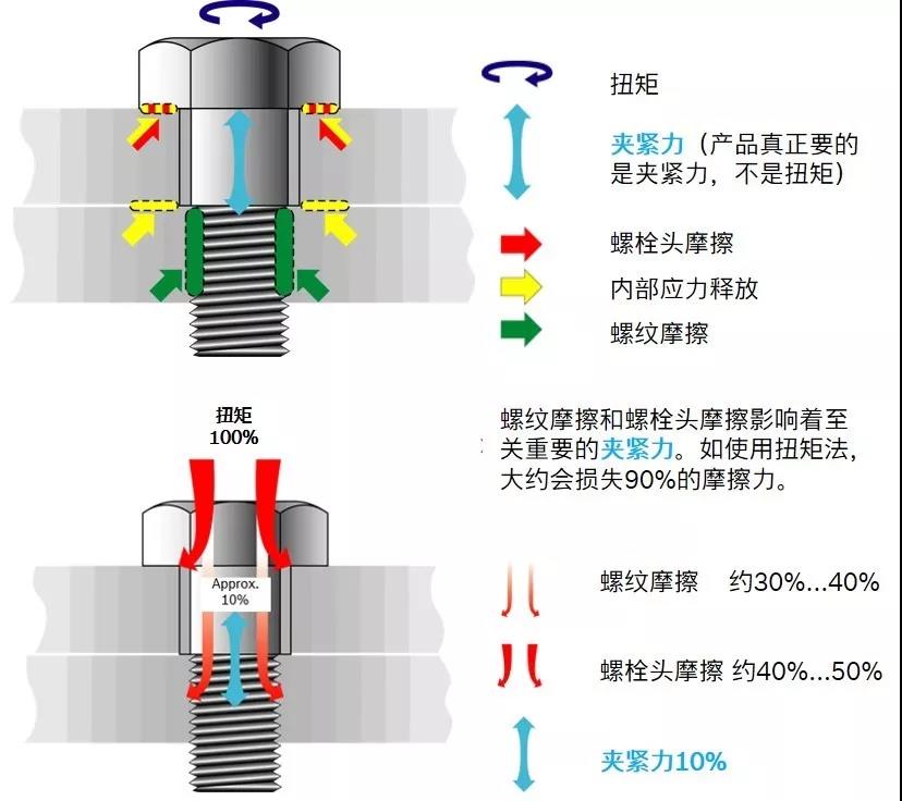如下图所示,真正的夹紧力只占输入驱动扭矩的10%左右,绝大多数消耗在了各种摩檫力上。因此同样大小的工艺扭矩,作用在螺栓上的夹紧力却会和预期大相径庭。