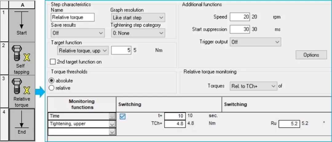 设置目标值为“Relative torque, upper”(即扭矩相对值)以及它的上下公差,另外设置好扭矩的相对值是相对于上一步的TCh+。