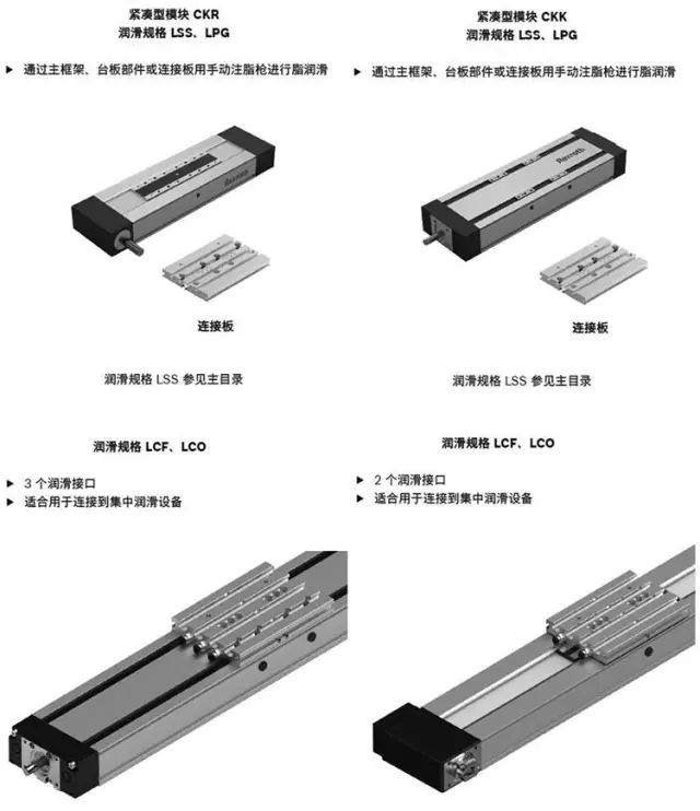 此外,集成模块 CKx 在润滑注油上也将提供更多选项:初始润滑(LSS)、防锈油(LPG)、连接中央脂润滑(LCF)、连接中央油润滑(LCO),中央润滑系统无需人工维护可实现低成本并高可靠性的自动润滑,同时按需维护可以减少润滑消耗量,并为系统结构设计提供了更多的可能性。