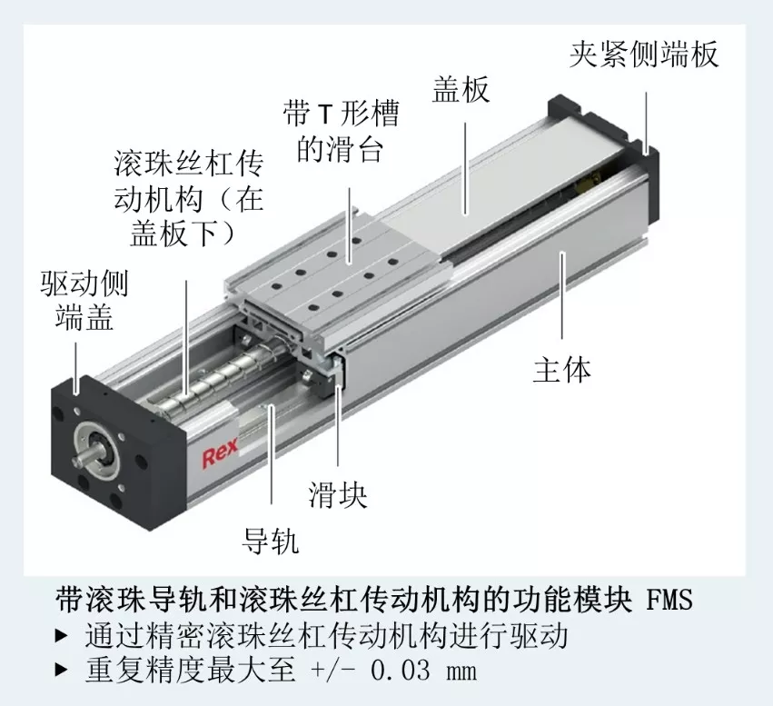 力士乐的产品能够满足您在质量、可靠性和精密性的多方面要求,新推出的功能模块具有在整个产品长度上的导程大、精度高、运行速度高和重复精度高( FMS 的重复精度最大可至 +/-0.03 mm, FMB 重复精度最大可至 +/- 0.05 mm )等优异的性能。另外,在使用过程中,您可通过补充润滑(润滑脂润滑)实现低成本保养。