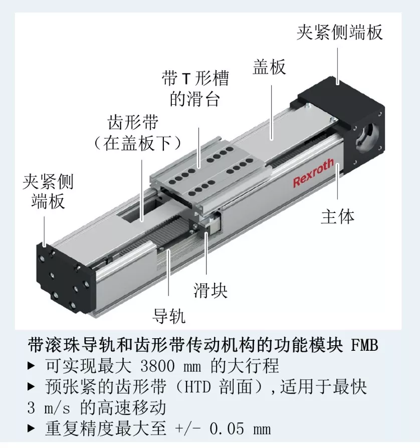 力士乐新推出的功能模块包含带滚珠导轨和滚珠丝杠传动机构的功能模块 FMS 以及带滚珠导轨和齿形带传动机构的功能模块  FMB 两款产品,产品采用极其紧凑的铝型材,集成有力士乐滚珠导轨,提供单轨和双轨两种款式,在所选尺寸的最大长度 Lmax 范围内,功能模块长度可以按照您的需求定制,功能模块在出厂时已装配好,您在使用前不需要再做额外的装配工作。在结构上,功能模块的内部滚珠导轨具有轻微预紧(预紧等级 C1 ),配合铝制滑台并带有 T 形槽,同时可选择铝制盖板保护安装元件。除此之外,产品还提供多种可选附件,您可根据实际需求灵活配置,配件列表如下: