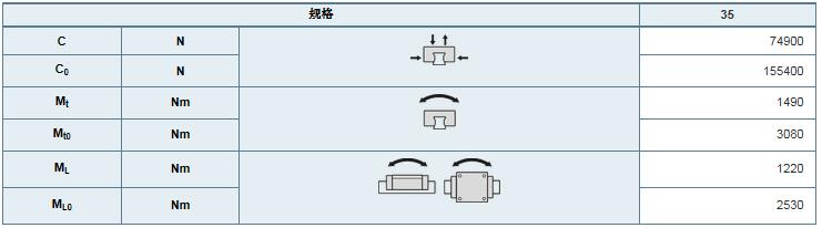 根据 DIN ISO 14728-1 标准,动态额定载荷和载荷力矩是基于 100000 米行程确定的。实际上,通常规定只有 50000 米。对比如下:将表中的值 C,Mt,和 ML 乘以 1.23.